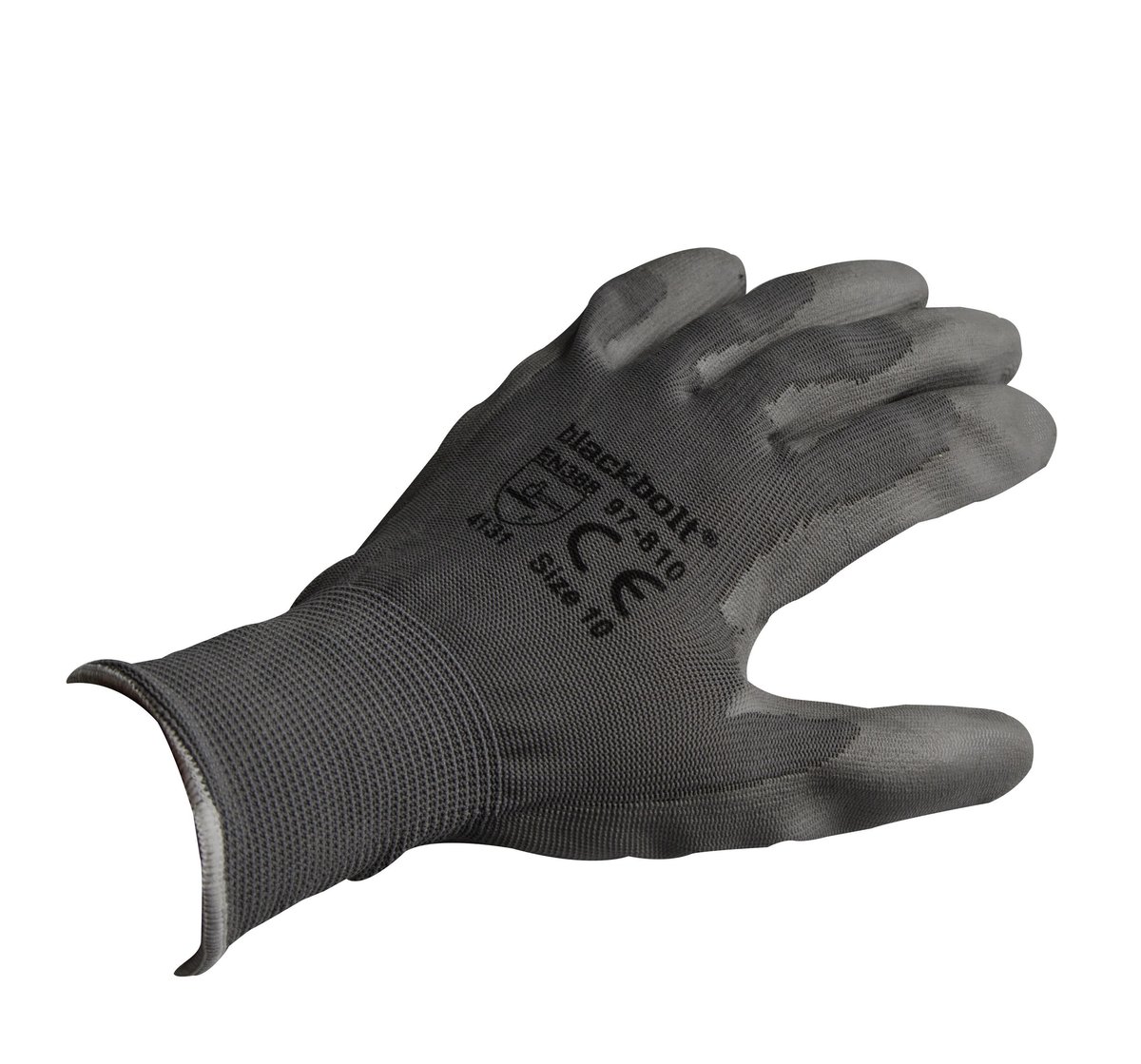 BlackBolt handske af tynd nylonstrik med ribkrave og ru polyurethan belægning i håndflade og på fingerspidser.
