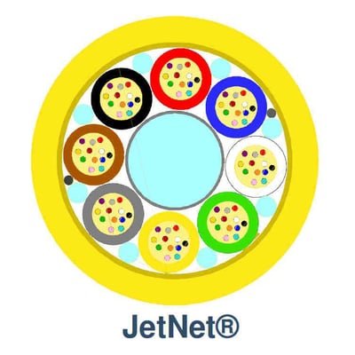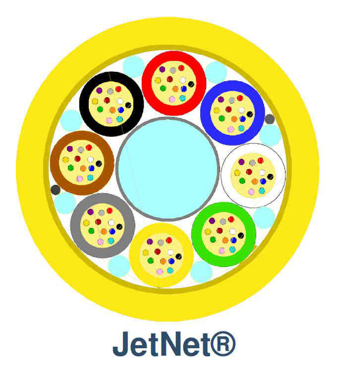 Snoet micro loose tube kabel til indblæsning i kabelrør, ideelt til FTTH fordelingsnet. Opbygget med central FRP stang, 8 loose tube rør (a 24 fibre 200m) og ydre PE kappe.