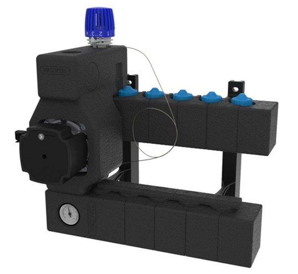 Wavin Comfia Midishunt med 4 afgreninger og Grundfos UPM3 AUTO 15-70 cirkulationspumpe. Inkluderer termostat, kontraventil og luftskrue.