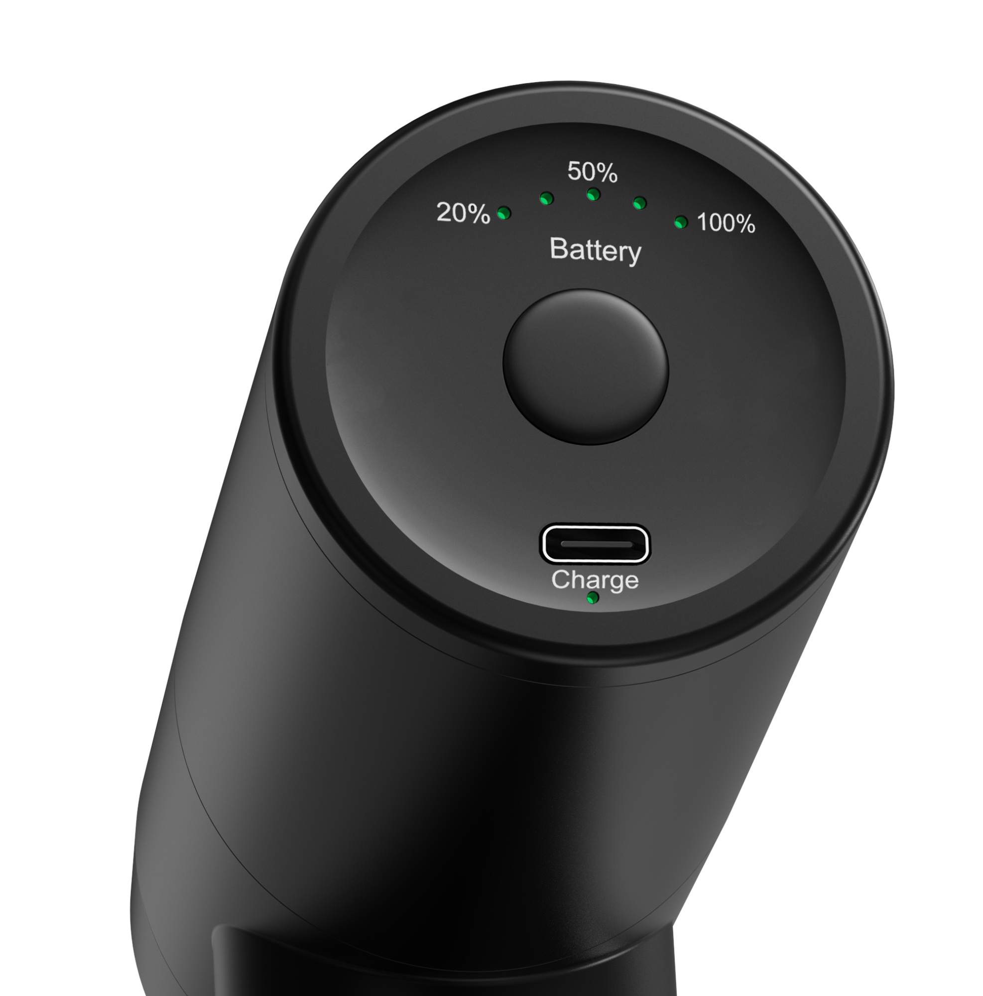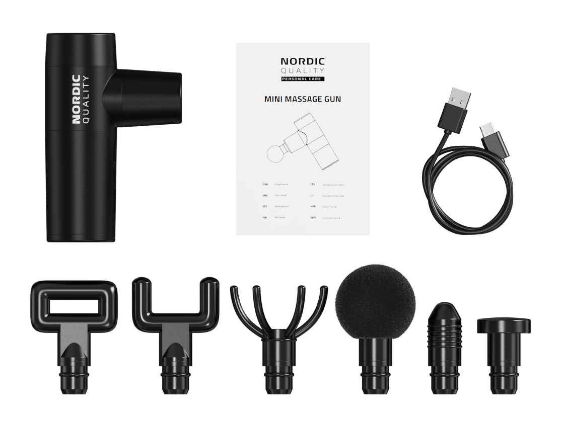 Kompakt og ledningsfri massagepistol med børsteløs motor. 5 intensitetsniveauer (1500-3000 RPM), 7,4 V DC, 24 W. 6 massagehoveder og USB-C opladning. Ideel til muskelafslapning.