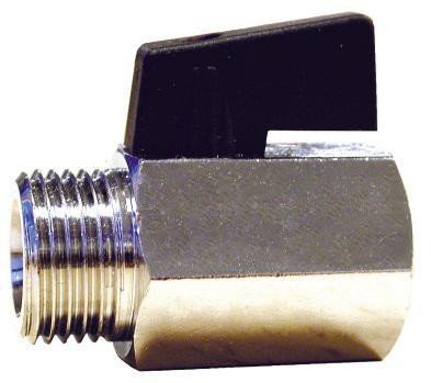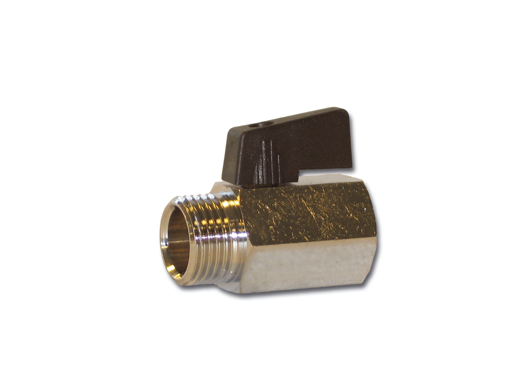 Minikuglehane med sort nylon greb, flad pakflade, hexagonal, TEA-belægning, muffe/nippel. 1/2 x 12 mm.