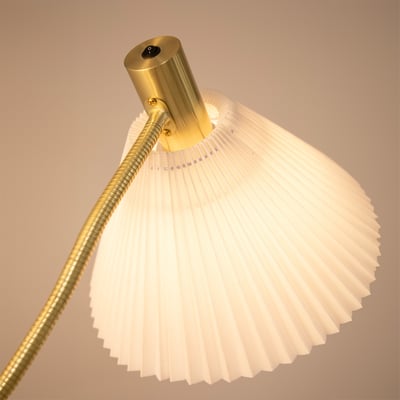 Elegant MIRA gulvlampe i børstet messing og hvid. Perfekt til indendørs brug. Med afbryder på lampeskærmen og 2 meter ledning.