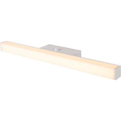Spejlarmatur med PIR-sensor og tidsindstilling. IP44-klassificeret til offentlige badeværelser. Integreret driver, hvidlakeret aluminium og opal kuppel for jævnt lys.