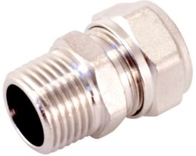 Presfitting som bruges til MLCP alupex-rør fra Uponor. Lige gevindovergang der har en preskobling i den ene ende og et indvendigt gevind i den anden.