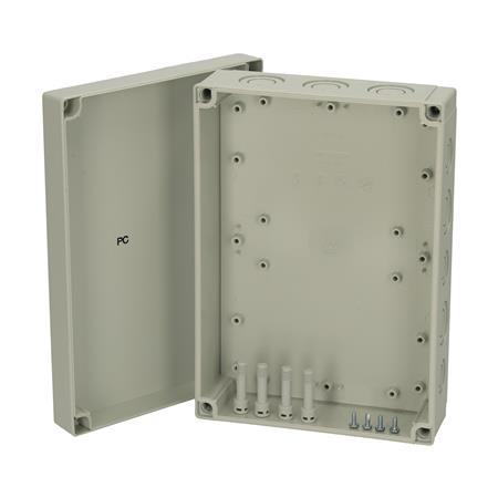 Robust monteringskasse i slagfast polycarbonat med IP66/67 kapslingsklasse og gråt dæksel. Ideel til krævende miljøer.