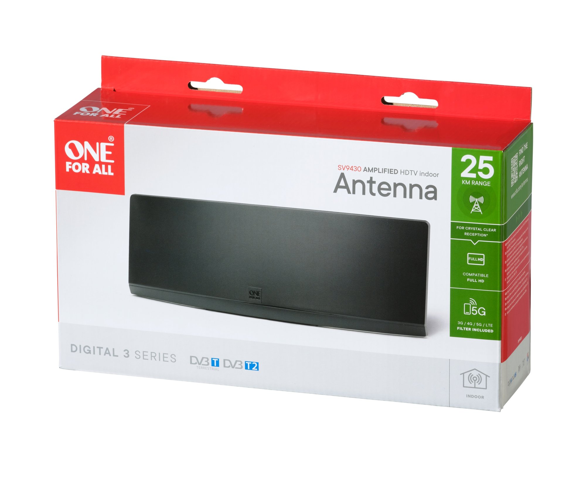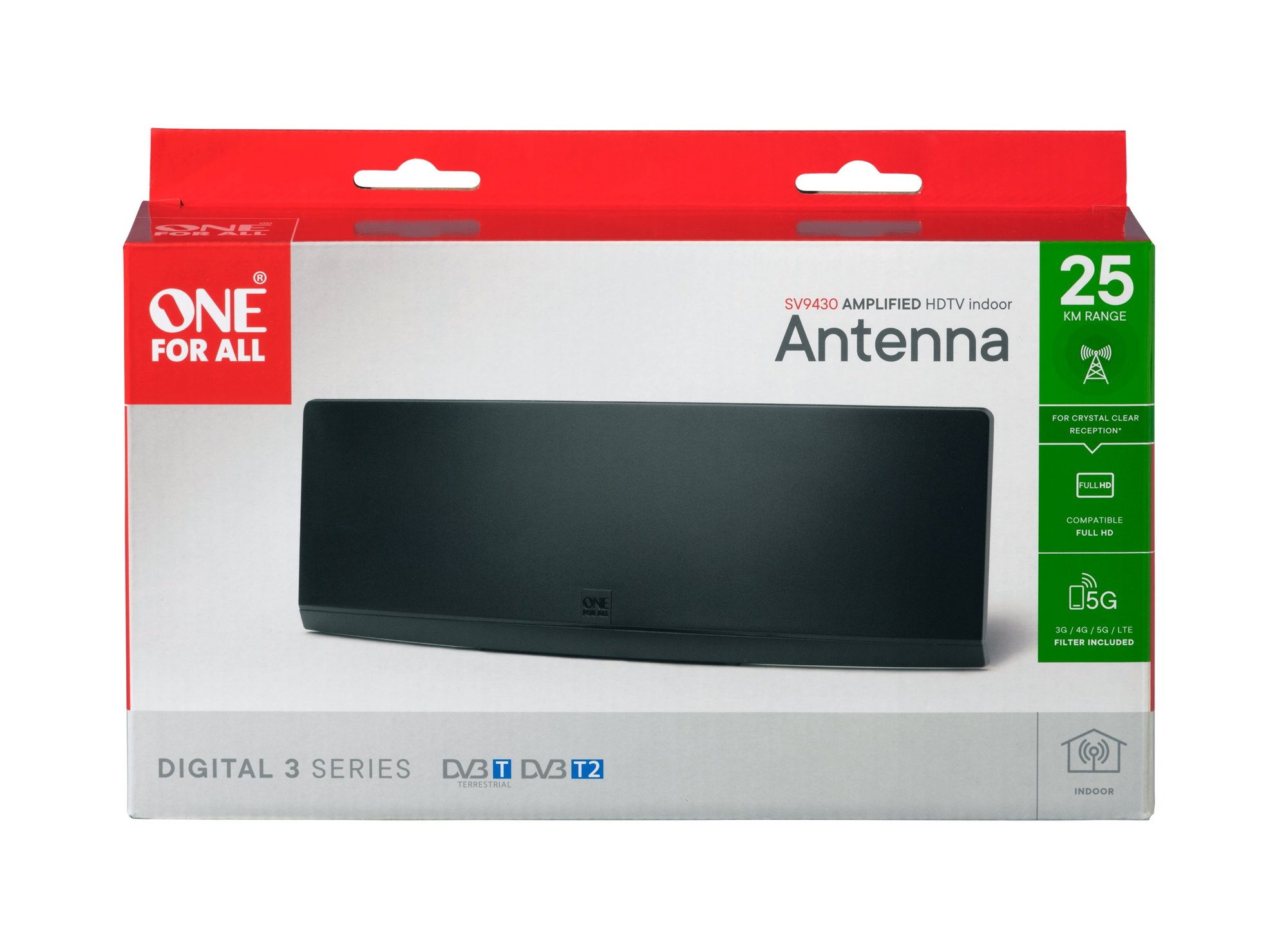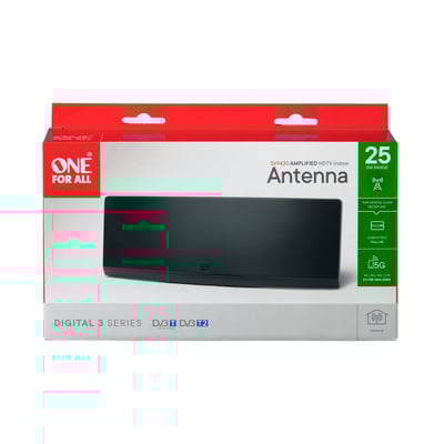 Indendørs antenne optimeret til at modtage fuld HD digitale TV-signaler. Anbefales indenfor en radius på 25 km fra senderen. Kompatibel med DVB-T/T2-programmer.