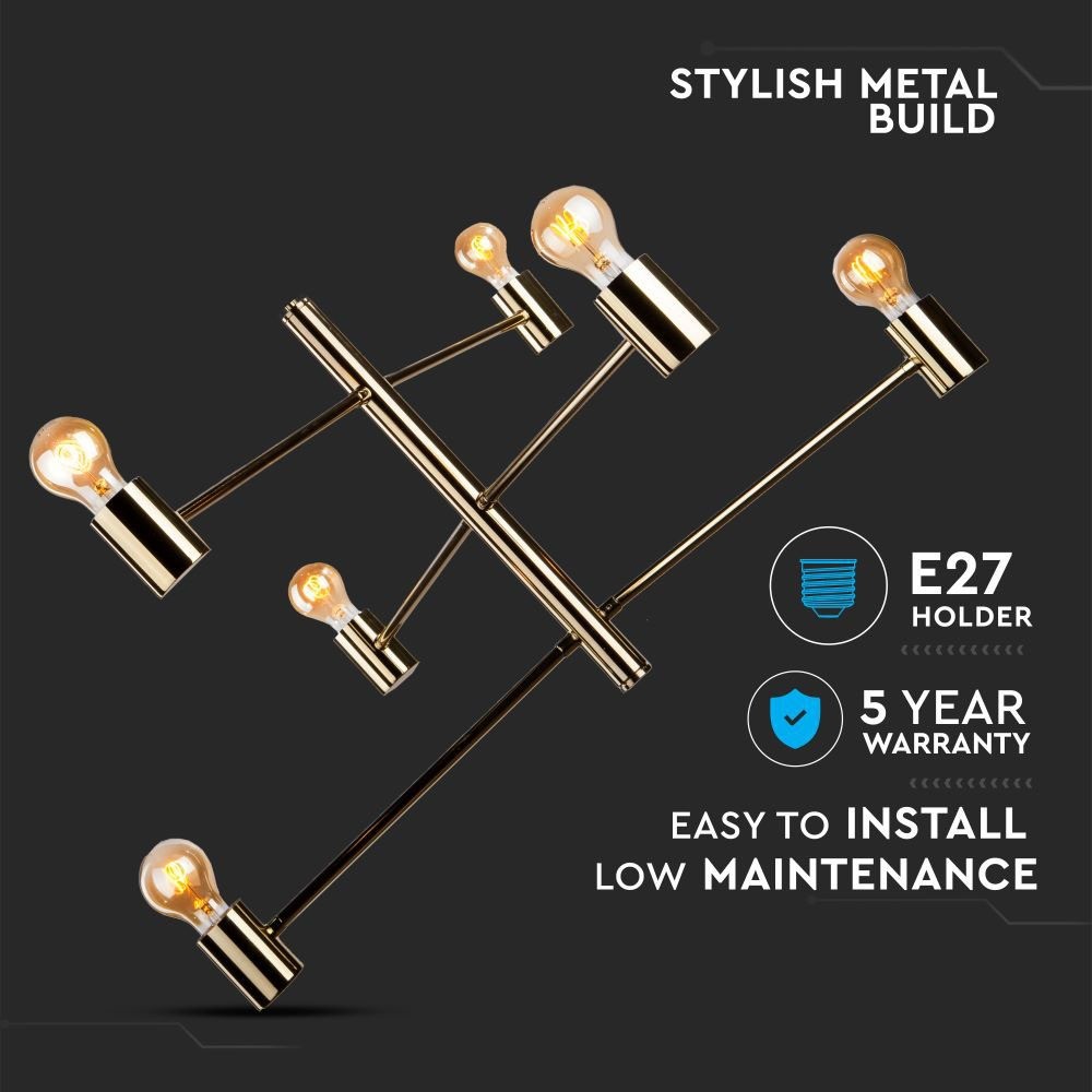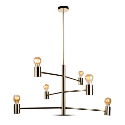 Elegant lysekrone i metal med plads til 6 E27-pærer og bevægelige arme, ideel til moderne indretning.