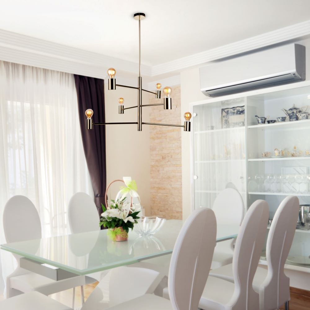 Oplev den stilfulde og funktionelle moderne lysekrone, der er designet til at tilføje et elegant touch til dit hjem. Denne lysekrone har bevægelige arme, hvilket giver dig mulighed for at justere belysningen efter behov. Den er udstyret med plads til 6 E27-pærer, hvilket sikrer en kraftfuld og effektiv belysning.