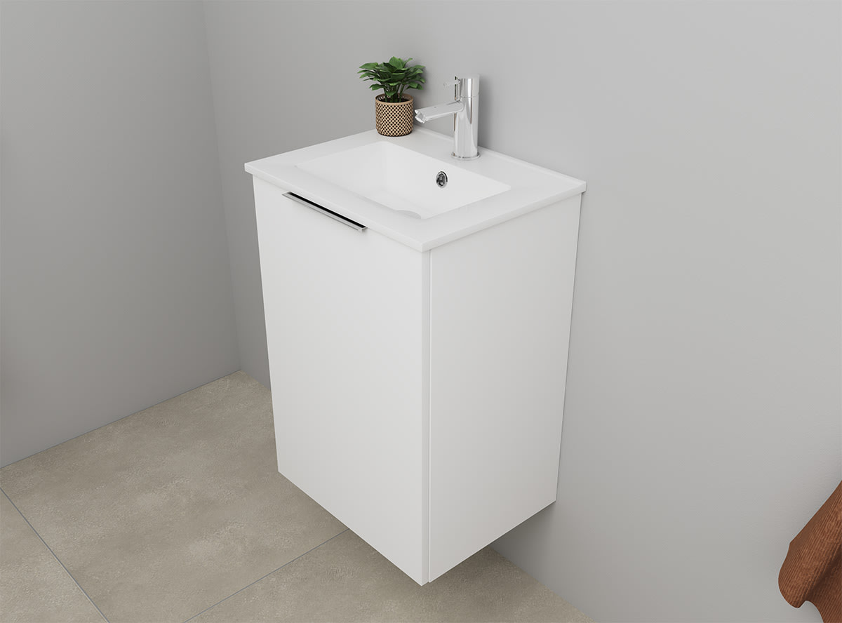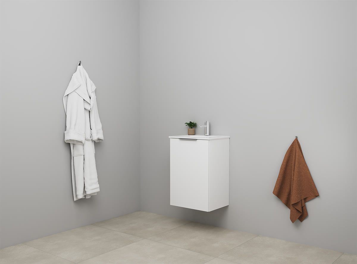 Sanibell Online møbelsæt i mathvid. Sættet indeholder porcelænsvask med overløb og hanehul, underskab med vendbar låge, justerbar hylde og krom greb. Mål: 46 x 36 cm.