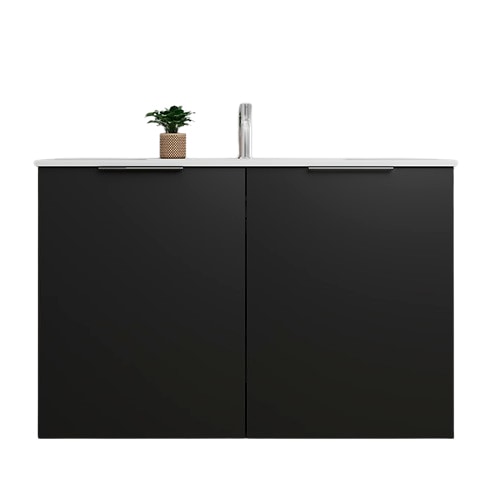 Sanibell Online møbelsæt i matsort, 101 x 36,5 cm. Leveres usamlet og inkluderer en porcelænsvask med overløb og hanehul samt et møbel med 2 låger og justerbar hylde. Optimal plads til rørføring.