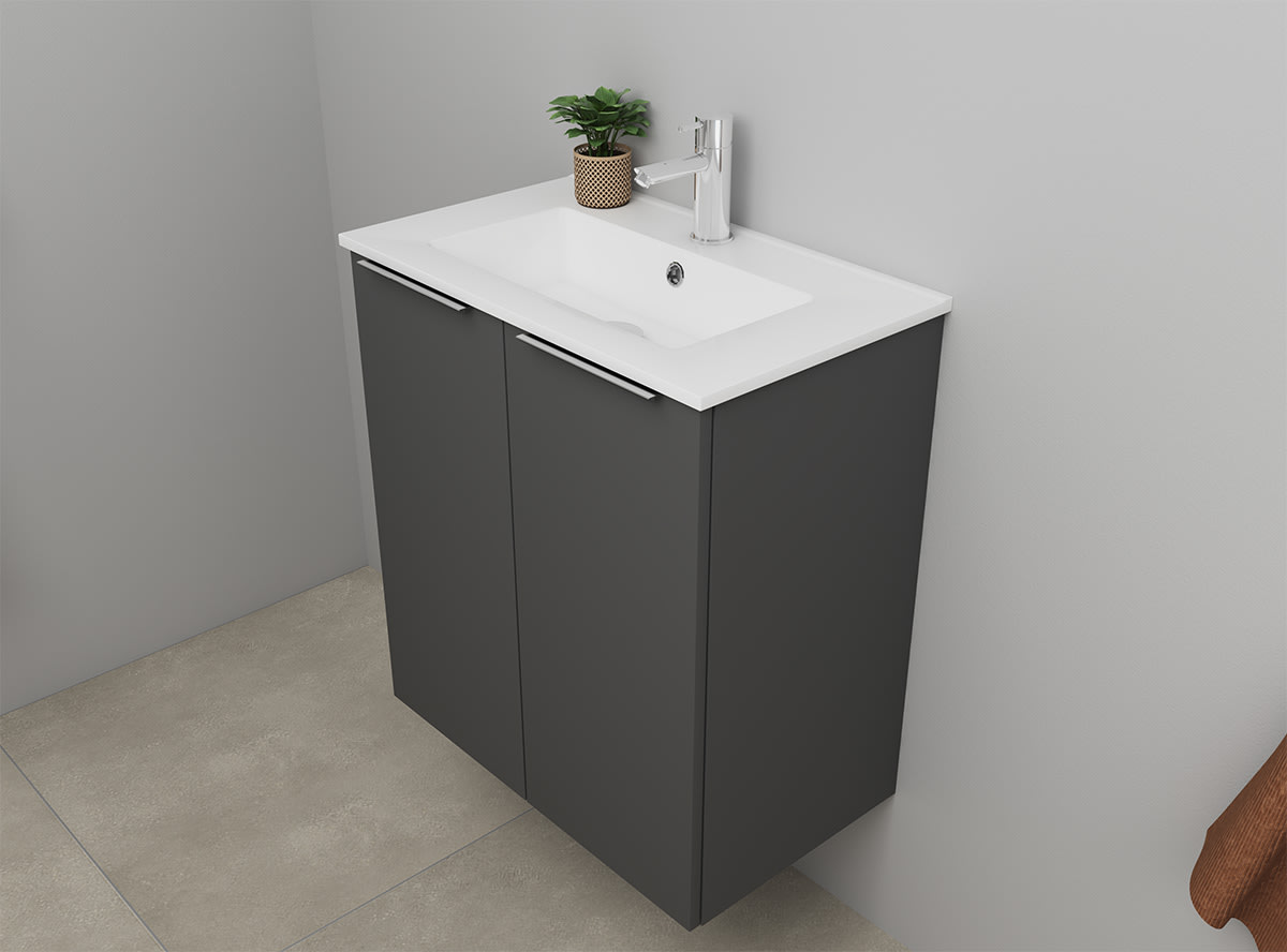 Møbelsættet består af en robust porcelænsvask med integreret overløb og et hanehul placeret i midten, klar til montering af din valgte armatur. Undermøblet er udstyret med to låger og en justerbar hylde, der kan flyttes 5 cm op eller ned efter behov, hvilket giver fleksible opbevaringsmuligheder. De medfølgende krom greb komplementerer det matte antracit finish.
