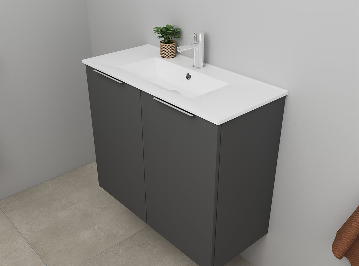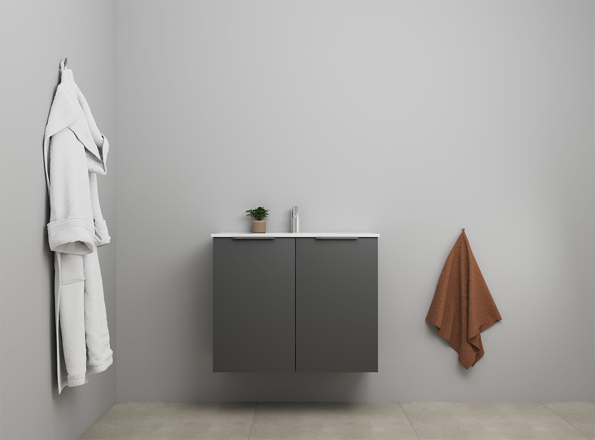 Dette Sanibell Online møbelsæt er designet til at give dit badeværelse et moderne og funktionelt løft. Sættet kommer i en elegant mat antracit farve og leveres usamlet som flatpack, hvilket gør transport og håndtering nemmere.