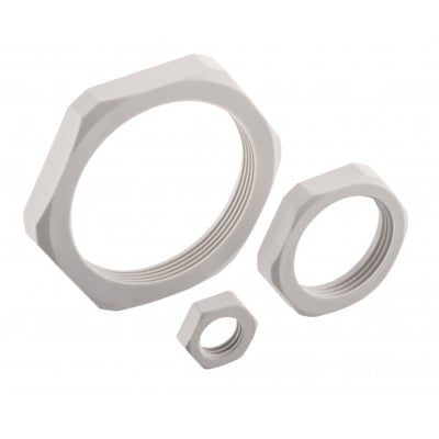 Glasfiberforstærket polyamid (PA6) møtrik. Halogenfri og egnet til temperaturer fra -25°C til +100°C (max. 150°C).