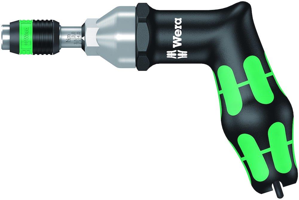 Wera momentskruetrækker med Kraftform-pistolgreb for optimal momentoverførsel og ergonomisk skruning. Variabel momentindstilling og Rapidaptor-teknologi for hurtigt bitskift.