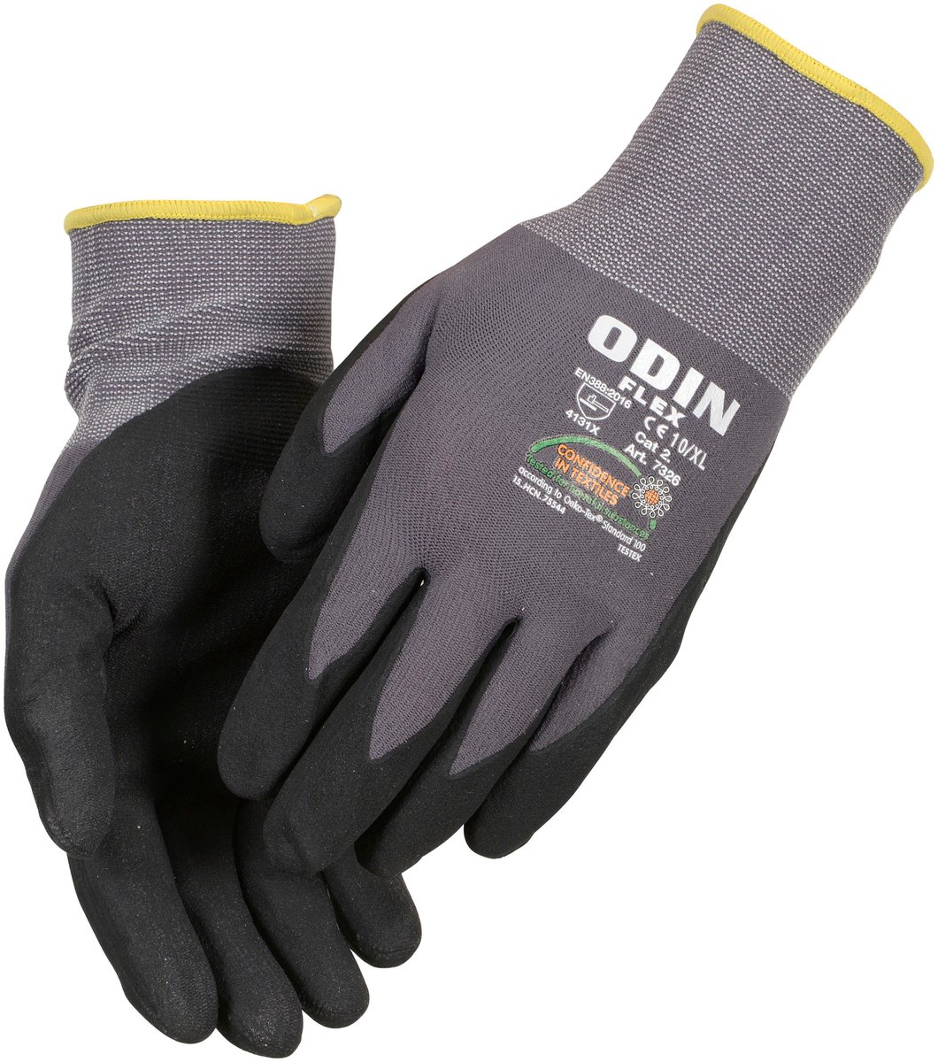 Denne montagehandske fra Odin Flex er designet til at give optimal komfort og beskyttelse under arbejdet. Handsken er fremstillet i et strikket materiale af Nylon og Spandex, hvilket sikrer en god pasform og fleksibilitet. Overfladen er belagt med nitril, der giver et forbedret greb og øget slidstyrke.