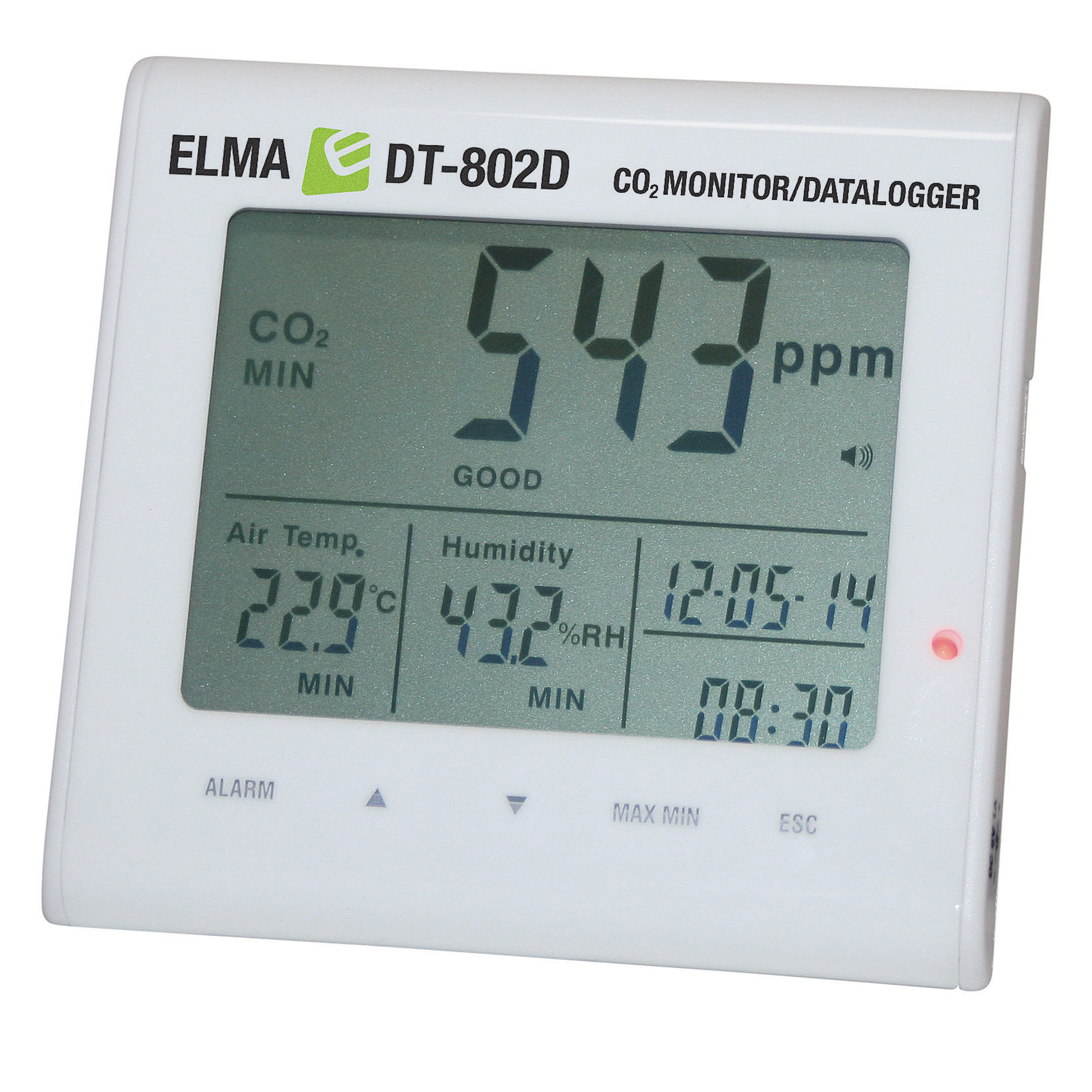 Elma DT802D CO2/relativ luftfugtighed/temperatur-monitor måler indeklimaet og viser de målte værdier direkte i displayet. Den kan endvidere logge værdierne over en tidsperiode, hvis periode afhænger af loggeintervallet (32.000 værdier). Monitoren er ideel til måling i skoler, institutioner, mødelokaler, kontorer osv.