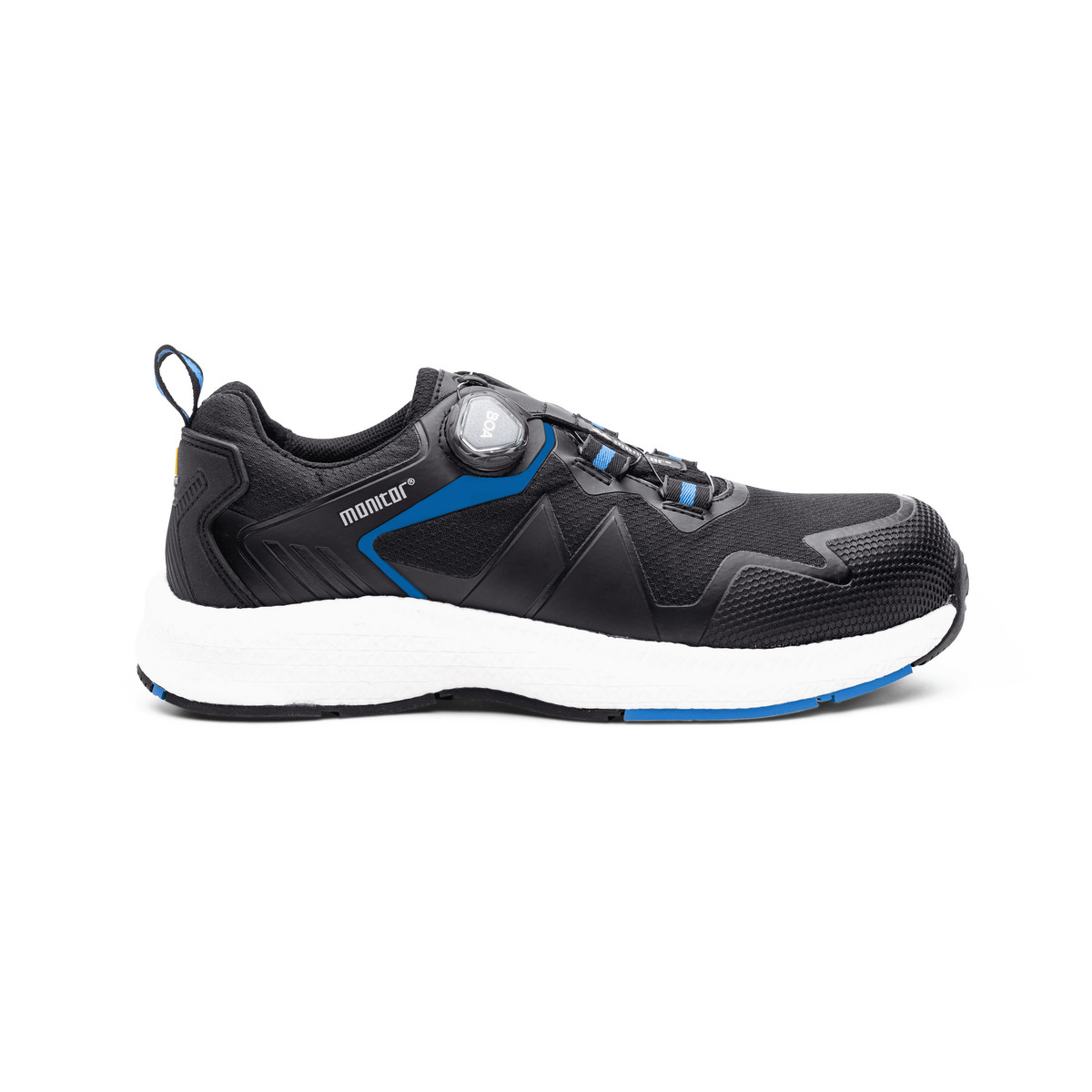 Lette og bløde sikkerhedssko fra Monitor med mellemsål af ETPU-materiale, skridsikker gummiydersål, fugtabsorberende tekstilfor og aluminium tåkappe.