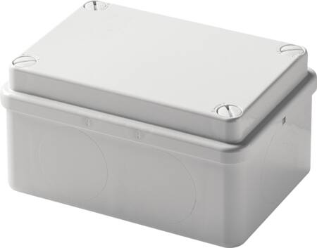 Vandtæt IP55 montagekasse i plast. Med glatte sider og lavt låg med skruer. Farve: RAL 7035.
