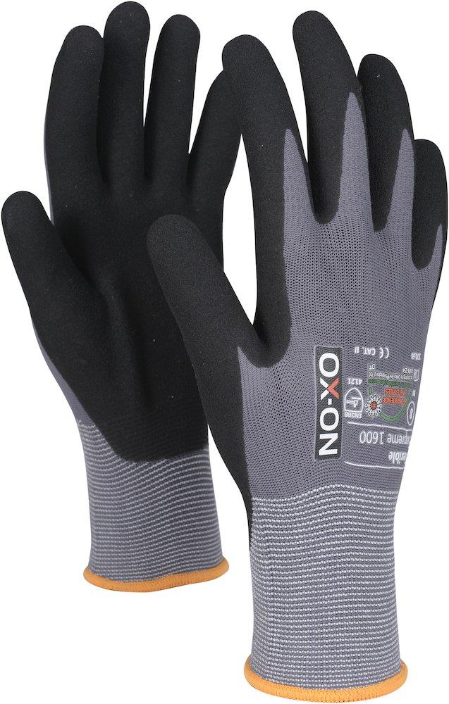 Slidstærk fingerdyppet strikhandske i nylon/lycra med nitrilskum belægning. Godkendelse: Kat. II: EN420 EN388.