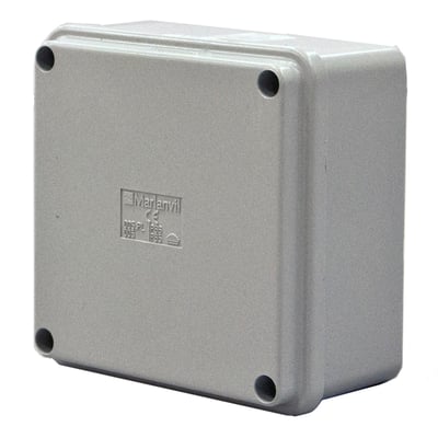 Grå plast monteringskasse med dimensionerne 100x100x50 mm. Fremstillet af halogenfrit materiale og resistent over for kemikalier og vejr. IP65.