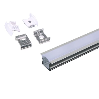 Komplet monteringssæt i aluminium til LED-strips, med diffuser for jævn lysfordeling. Måler 2000x24x14,2 mm.