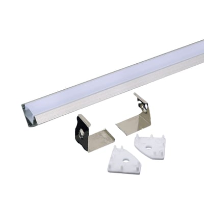 Komplet monteringssæt i aluminium med diffuser til hjørnemontering af LED-strips. Måler 2000x19x19 mm og har en sølvfinish.
