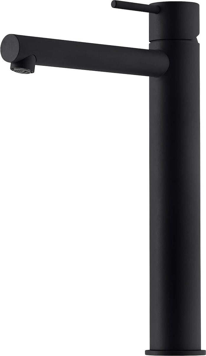 Elegant Mora Inxx II Sharp High håndvaskarmatur i mat-sort. Designet til vaskefade med keramisk tætning, indbygget flowbegrænser og vandbesparende funktion.
