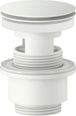 Mora Push Down bundventil med overløb og en dybde under vask på kun 39 mm. Mat hvid finish.
