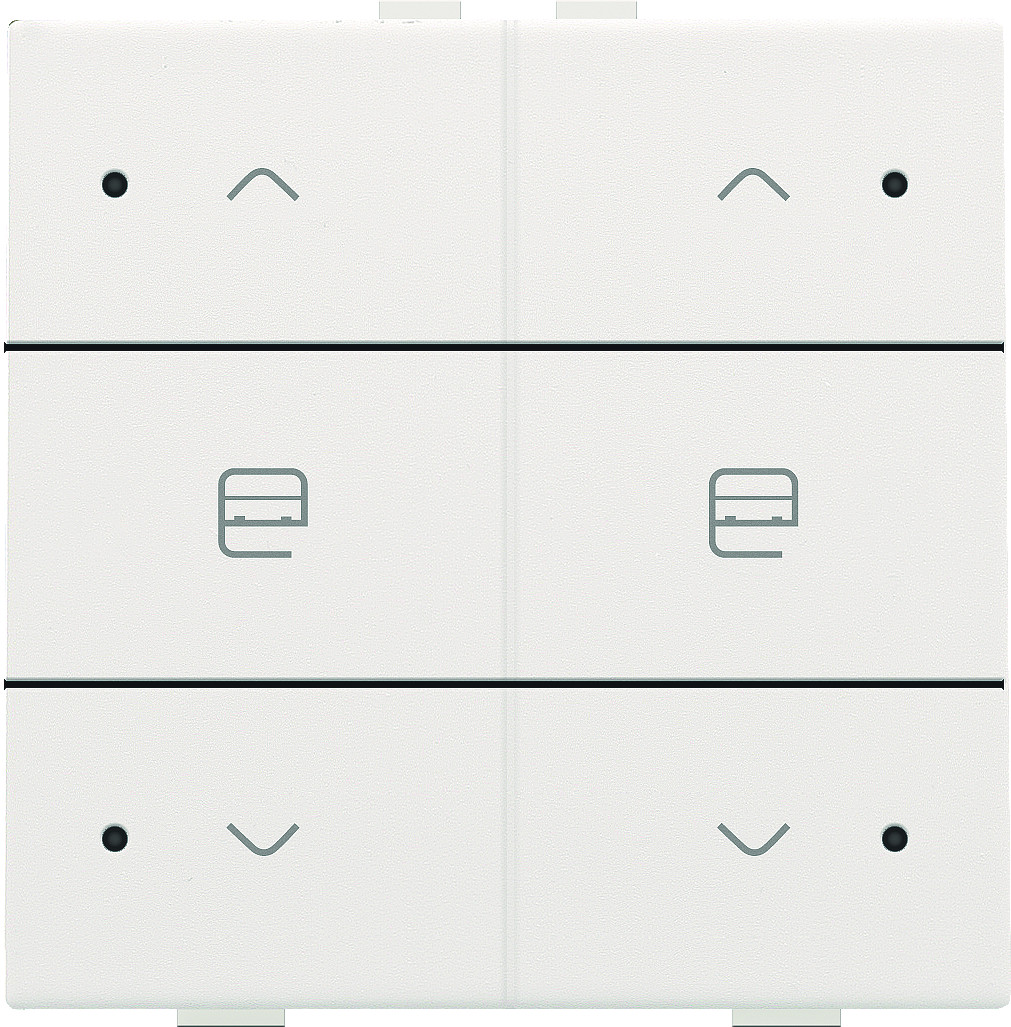 Styr nemt 2 motorer, f.eks. til gardiner, med dette dobbelte motortryk fra Niko. LED-indikator viser status. Klikmekanisme sikrer nem montage på busprint. Fås i flere farver.