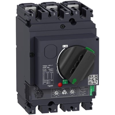 TeSys GV5P150F motorværn med termomagnetisk relæ, 150A, 55..75kW, 3P, 36kA og drejegreb. Tilslutningerne klikkes direkte på enhedsterminalerne eller fastgøres med clips.