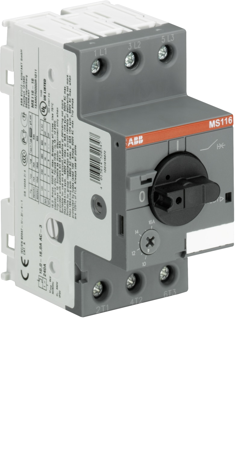 Dette er et 3-polet, håndbetjent motorværn af typen MS116 fra ABB. Det har tripklasse 10 og en brydeevne på 50 kA ved 400V AC.