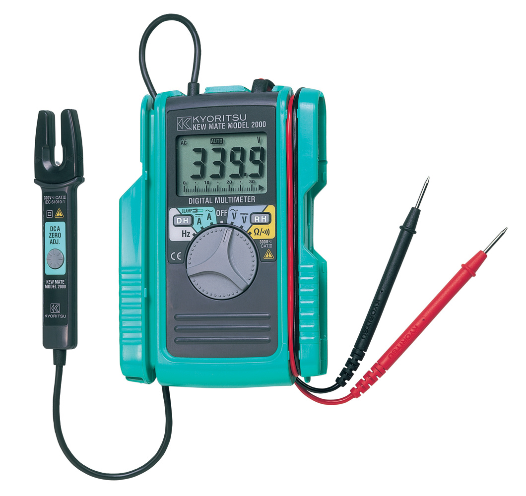 Kewmate 2000 multimeter med åben strømtang til AC/DC måling. Måler spænding, strøm, modstand, frekvens. Kompakt format med beskyttelseskappe.