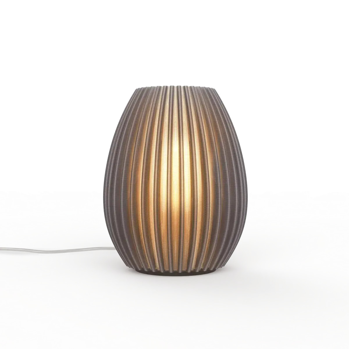 myCreation Jagg Two bordlampe i mørkegrå med en ribbet struktur og varm, gul lyskilde, placeret på en hvid baggrund med ledning synlig.