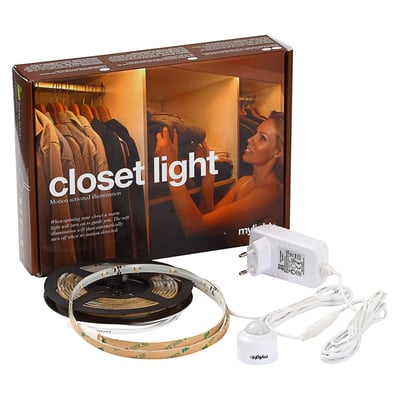 Det originale klædeskabslys, opfundet og udviklet af danske e3light. Når du åbner skabet, tændes et varmt lys, der viser dig vej. Det bløde lys slukker automatisk, når der ikke registreres bevægelser.