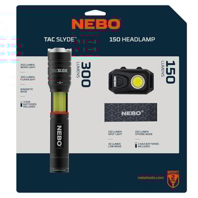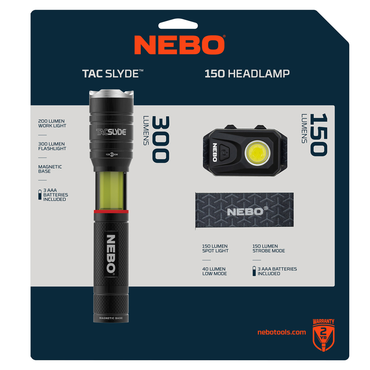 Denne sampak fra NEBO indeholder en Tac Slyde lygte og en pandelampe, der er ideel til en bred vifte af anvendelser, fra professionelt arbejde til udendørs aktiviteter.