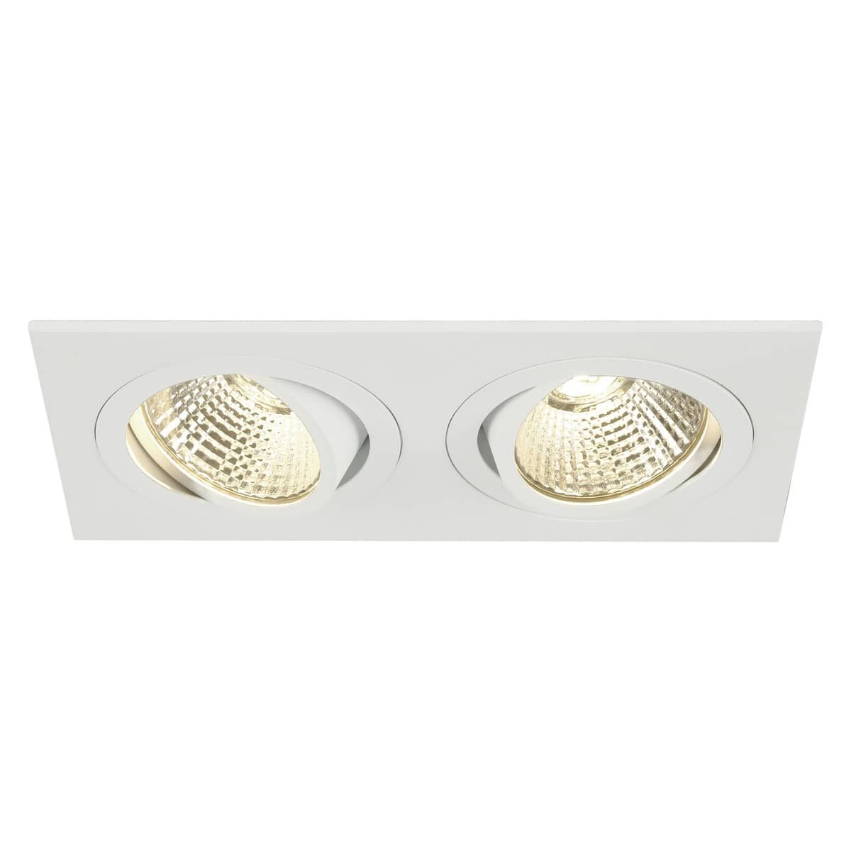 Rektangulær indbygningsspot med dobbelthovedet LED. Giver 3000 K lys og har en spredningsvinkel på 38°. Inkluderer driver og clipsfjedre.