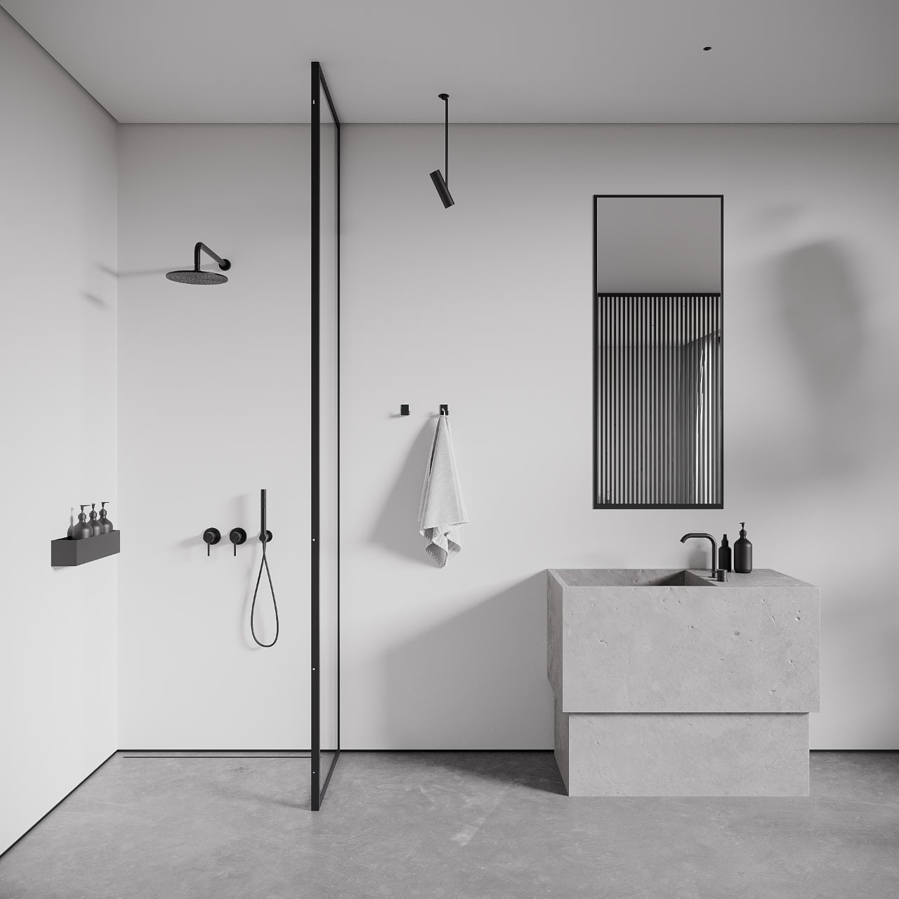 Praktisk badeværelseskrog i sort, mat pulverlakeret design. Sælges i sæt af 2 stk. med målene 50x40x30 mm.