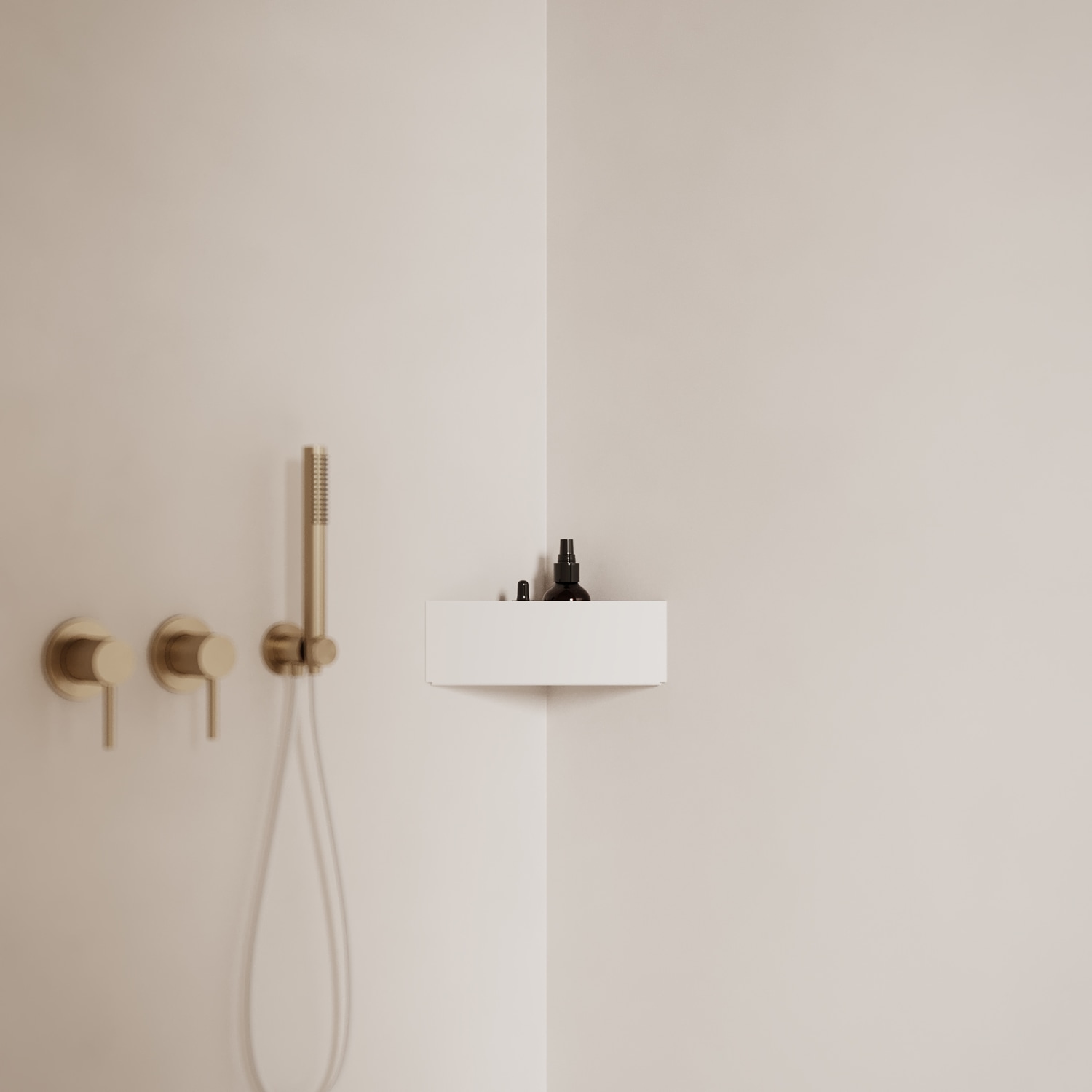 Praktisk og stilfuld hjørnehylde til badeværelset. Fremstillet i hvid pulverlakeret metal med en mat finish. Mål: 285x100 mm.