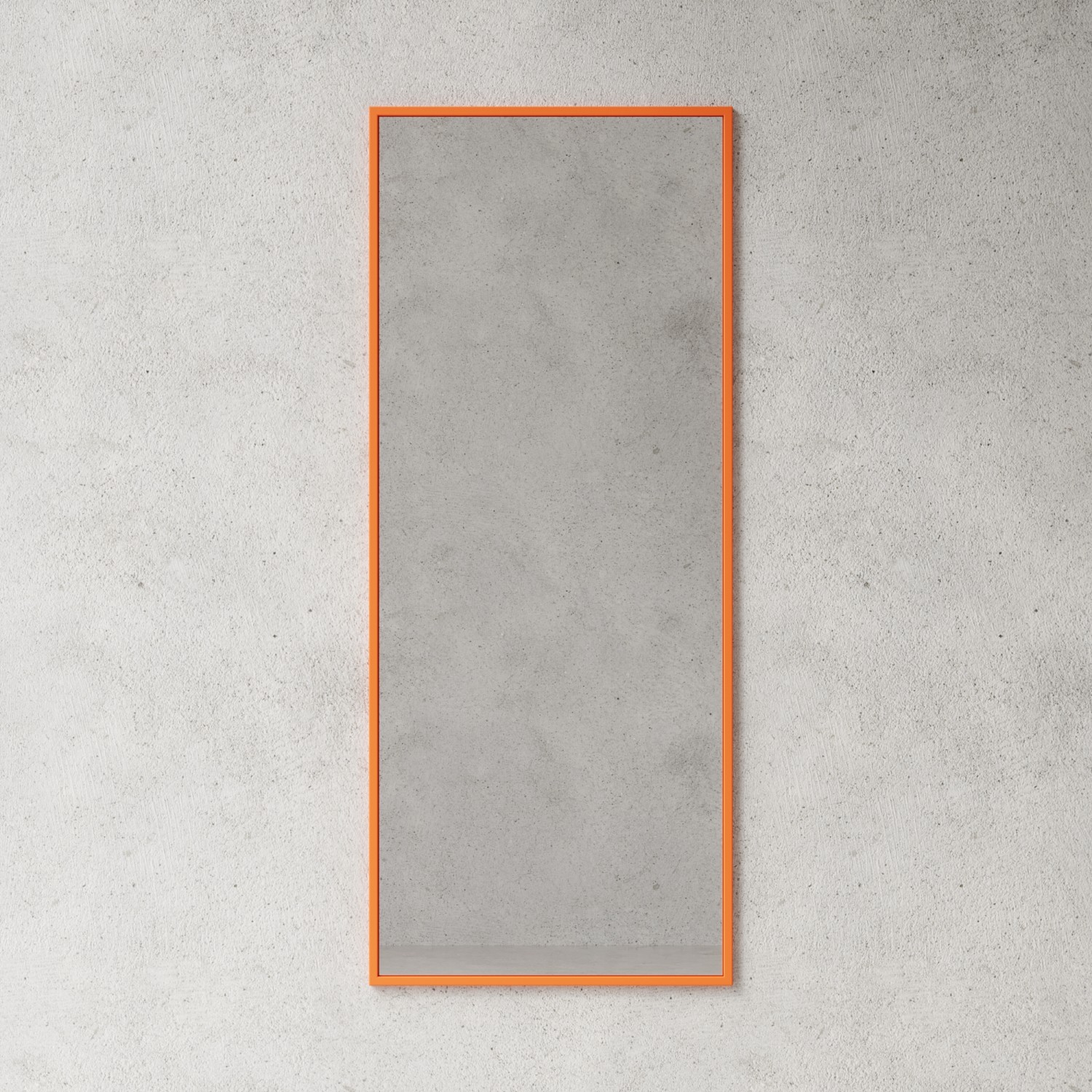 Stilrent firkantet spejl fra Nichba med orange pulverlakering. Mål: 145x60x0,8 cm.