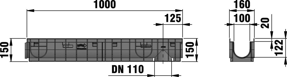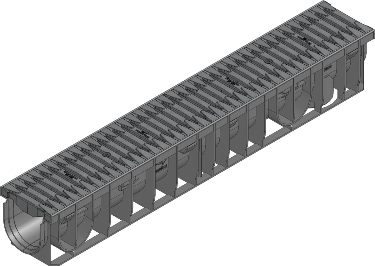 NID rende med rist, 160 x 150 x 1000 mm, 25 t, PA-GF, sort