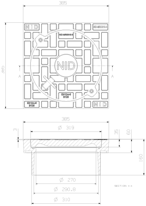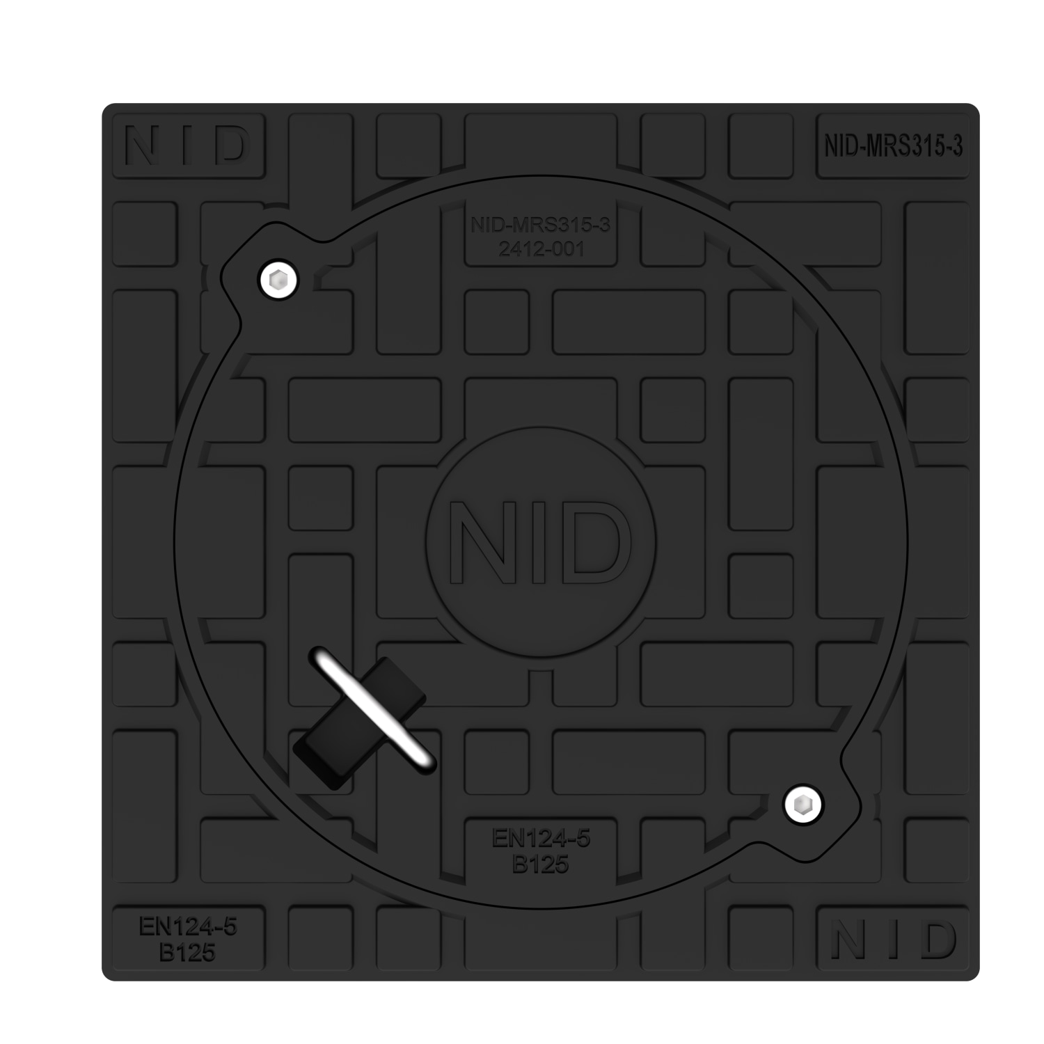 Dette NID 315 karm/dæksel er designet til en firkantet fast montering og har en bæreevne på 12,5 ton. Produktet er fremstillet af kompositmateriale og inkluderer en låsemekanisme.