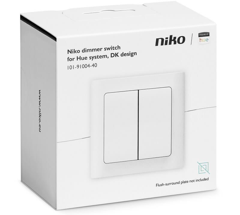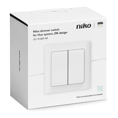 Afbryder / kontakt til Philips Hue LED-pærer. Niko dimmer switch er en del af "Friends of Hue" familien, som er godkendt af Philips. Trådløs tænd/sluk og dæmpning af dine Philips HUE LED-pærer. Trådløs og passer i LK FUGA.