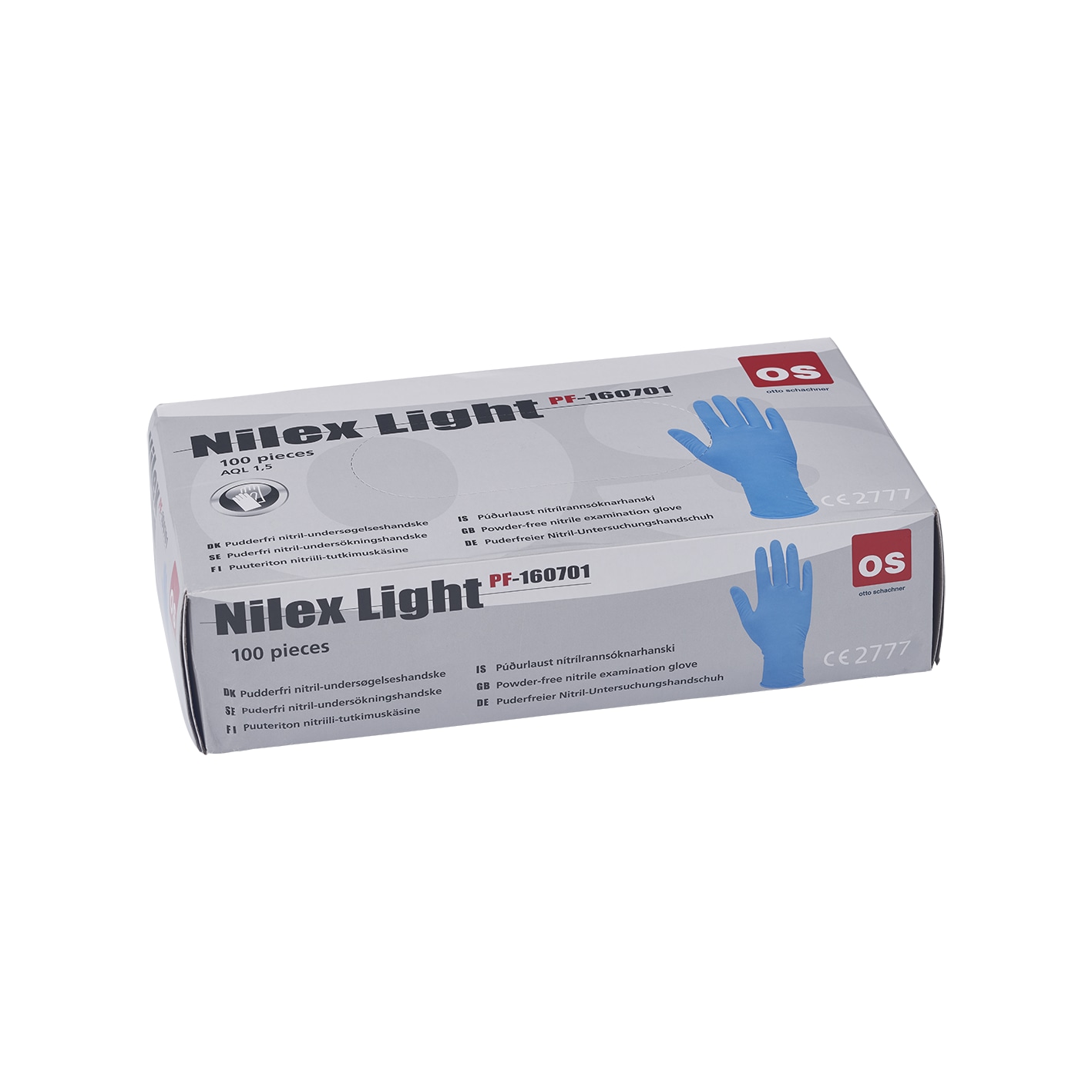 Nilex Light engangshandsker i nitril. Pudderfri med en tykkelse på 0.08 mm, blå farve og prægning på fingerspidserne. Ideel til fødevareproduktion, montage og laboratoriearbejde.