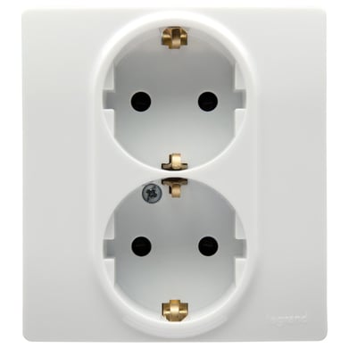 Dobbelt stikkontakt med plade fra Legrand. Giver dig mulighed for at erstatte 1 stik med 2 stikkontakter.