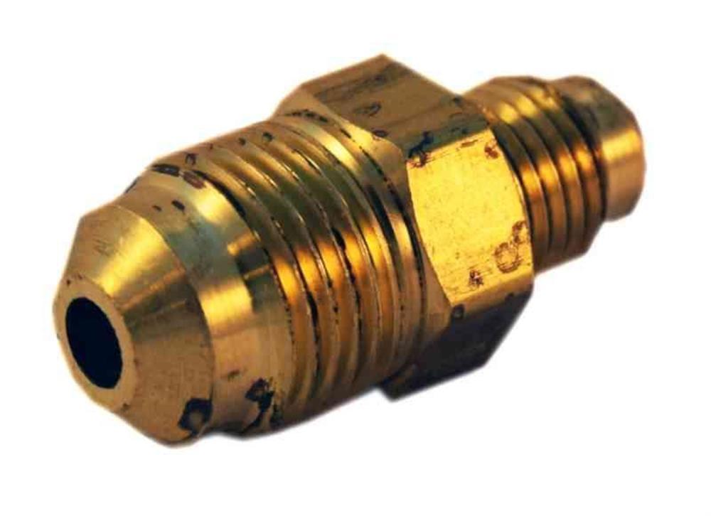 UR2-0086 nippel med 3/8" flare udvendig og 1/2" flare udvendig gevind, ideel til sammenkobling af rør med forskellige dimensioner.