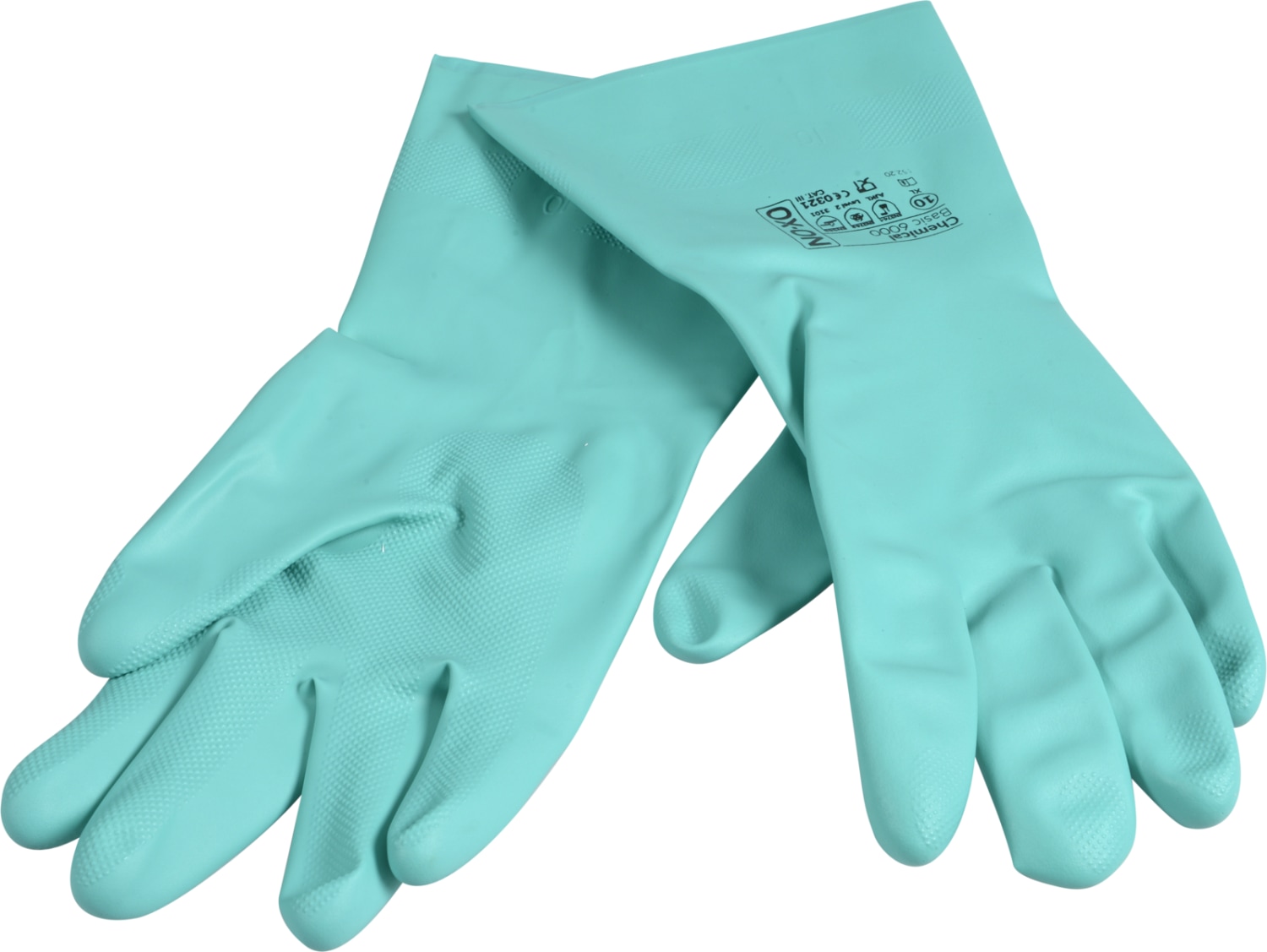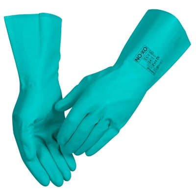 Kemikaliebeskyttelseshandske i 100% grøn nitril med ru mønster i håndfladen for ekstra godt greb. Godkendt til fødevarekontakt og beskytter mod opløsningsmidler.