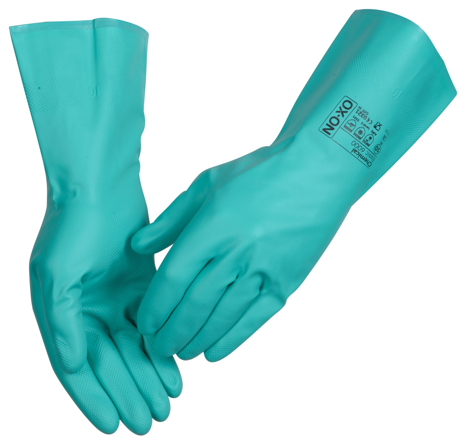 Kemikaliebeskyttelseshandske i 100% grøn nitril med ru mønster i håndfladen for ekstra godt greb. Godkendt til fødevarer og beskytter mod opløsningsmidler og oliebaserede kemikalier.