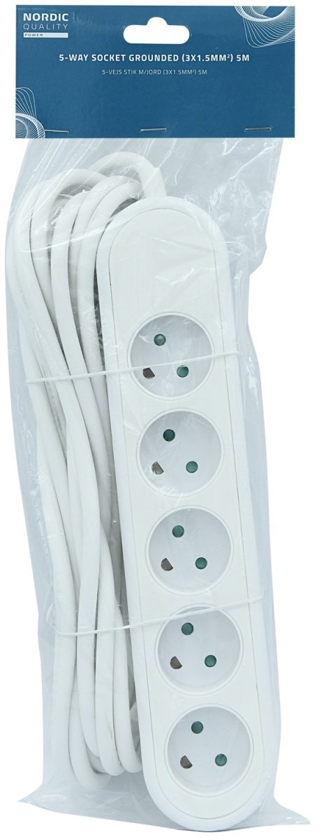 Dansk 3-vejs stik med jord og har et indbygget PVC-kabel (3x1,5 mm²), 5m, hvid • 5 udtag • Med jord • Indbygget PVC-kabel.