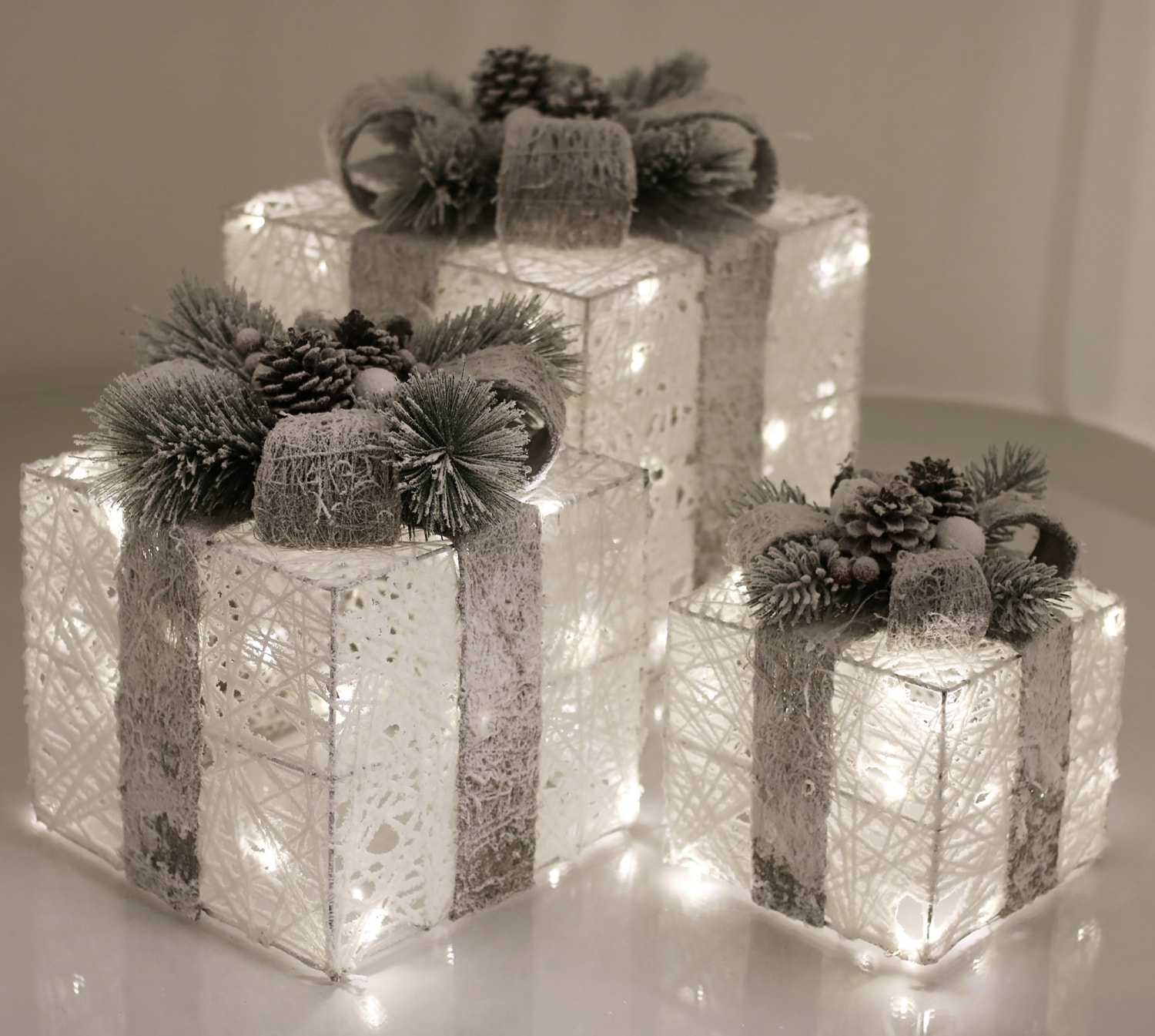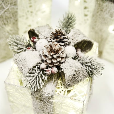 Skab en hyggelig julestemning i dit hjem med dette charmerende sæt af 3 julepakker fra Nordic Winter. Hver pakke er omhyggeligt dekoreret med lys, en elegant sløjfe og naturlige kogler, der tilføjer et festligt præg til enhver indretning.