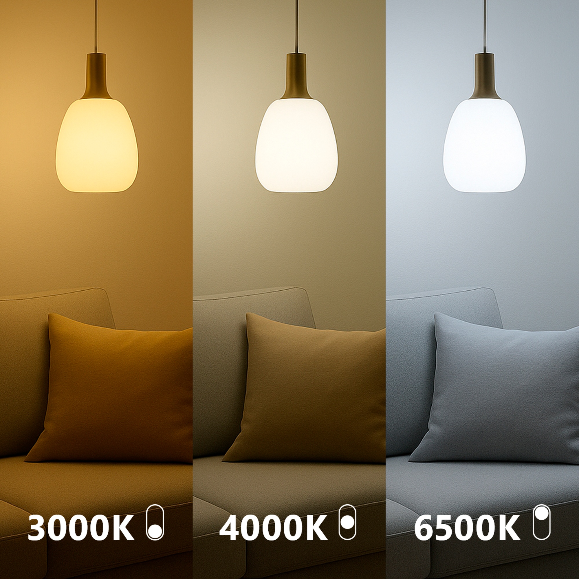 - CCT Switch: Juster nemt farvetemperaturen mellem 3000K (varm hvid), 4000K (neutral hvid) og 6500K (kold hvid) direkte på pæren.